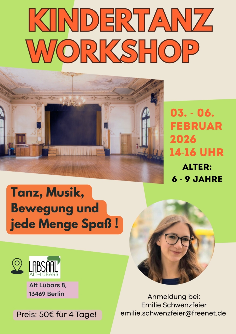 Erstmals findet in den Winterferien ein Tanzworkshop für Kinder statt. Tanz, Musik und Bewegung für Kinder von 6 -9 Jahren. Geleitet wird der Kurs von Emilie Schwenzfeier. Sie ist selbst noch Schülerin und eine begeisterte Tänzerin. Sie möchte gerne Ihr Wissen und den Spaß am Tanz an die Kinder weitergeben. Der Labsaal ist in der Winterferienwoche an vier Tagen jeweils von 14:00 – 16:00 geöffnet.